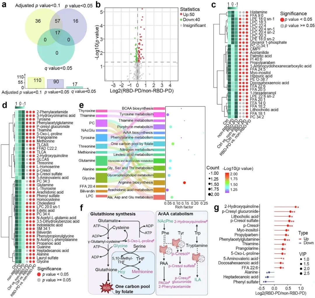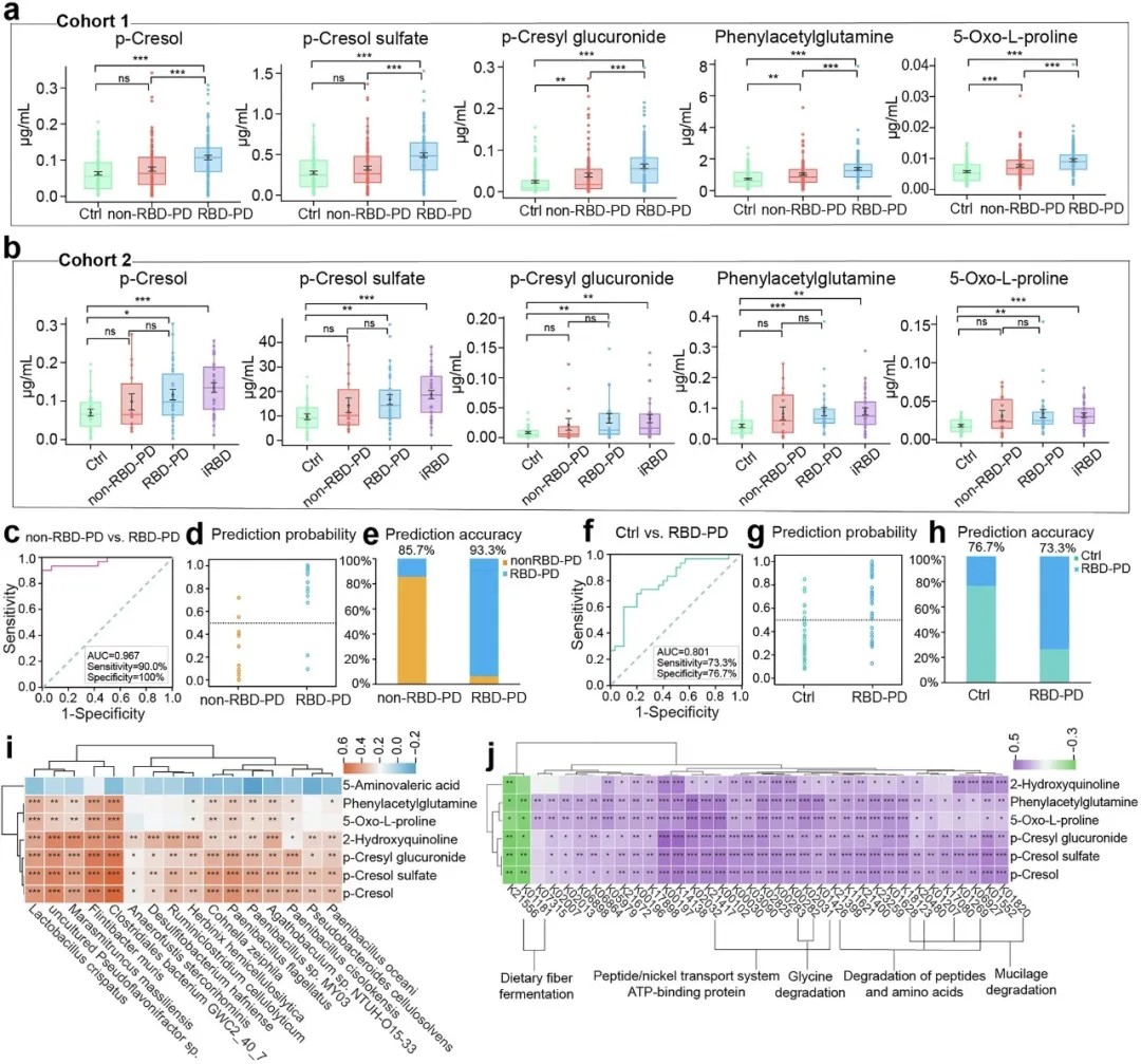 研究最关键的发现在于,RBD-PD亚型患者表现出区别于其他PD患者的特异性代谢紊乱。其特征是肠道菌群来源的毒性芳香族氨基酸分解代谢产物在血液中显著累积。值得注意的是,这些相同的代谢改变在处于帕金森病前驱阶段的特发性RBD(iRBD)患者中也同样存在,提示这些变化可能是该亚型固有的生物学特征,而非疾病进展的后果。