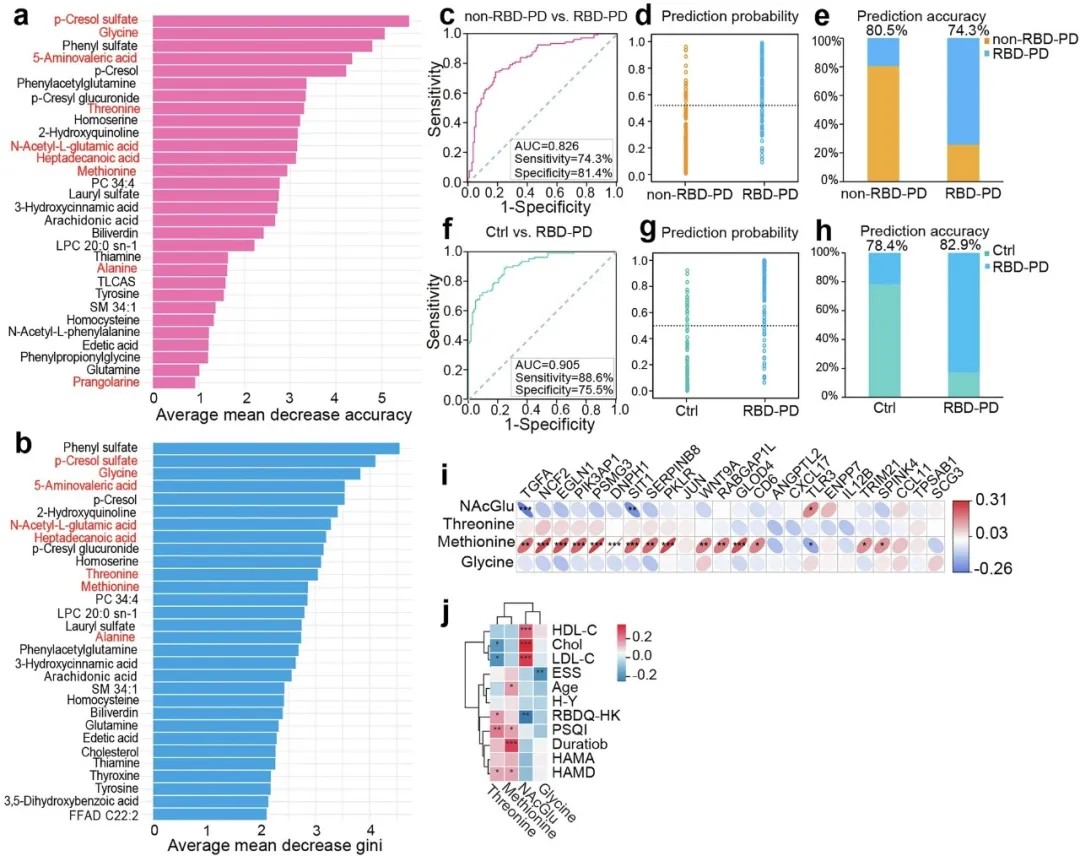 基于上述发现,研究团队构建了一个包含9种代谢物(包括对甲酚硫酸盐、甘氨酸、5-氨基戊酸等)的诊断模型。该模型在区分RBD-PD与不伴RBD的PD患者时,在验证队列中显示出高达0.967的曲线下面积(AUC),灵敏度为90.0%,特异性为100%,预测准确性优异。这为未来实现帕金森病的亚型精准分型提供了强有力的工具。