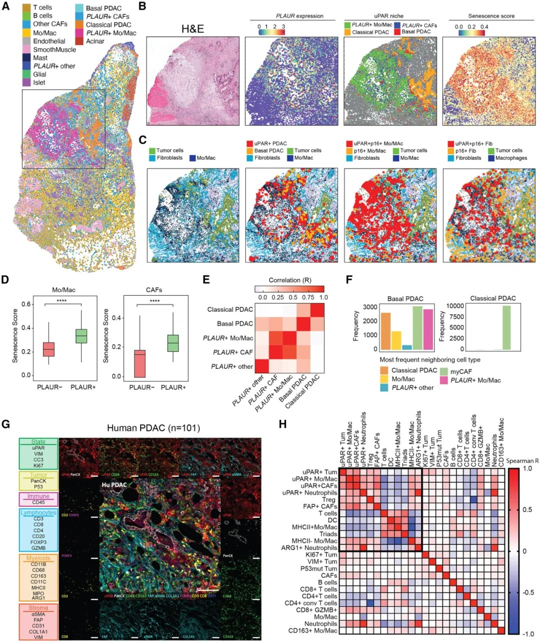 更关键的是,uPAR不仅高表达于肿瘤细胞本身,还高表达于肿瘤内部具有衰老特征的癌相关成纤维细胞和髓系免疫抑制细胞。空间转录组学和多重免疫荧光分析揭示,这些uPAR阳性的肿瘤细胞、基质细胞和免疫细胞在空间上紧密聚集,形成了一个结构保守的促纤维化、免疫抑制性“生态位”。这个生态位如同肿瘤的“保护罩”,将效应T细胞排斥在外,是导致治疗抵抗的重要原因。