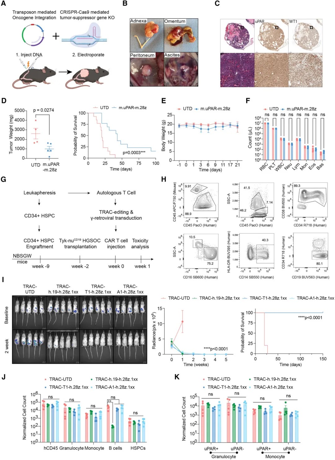 在多种小鼠模型中,uPAR CAR-T疗法显示出卓越疗效。在肺癌、胰腺癌、卵巢癌的细胞系及患者来源的异种移植瘤模型中,单次输注uPAR CAR-T细胞可诱导肿瘤快速、持久消退,并显著延长小鼠生存期。尤为重要的是,在高致死性的高级别浆液性卵巢癌模型中,该疗法不仅能根除原位肿瘤,还能有效清除已广泛播散的腹腔转移灶,并在模拟临床辅助治疗场景中清除残余病灶,防止复发。