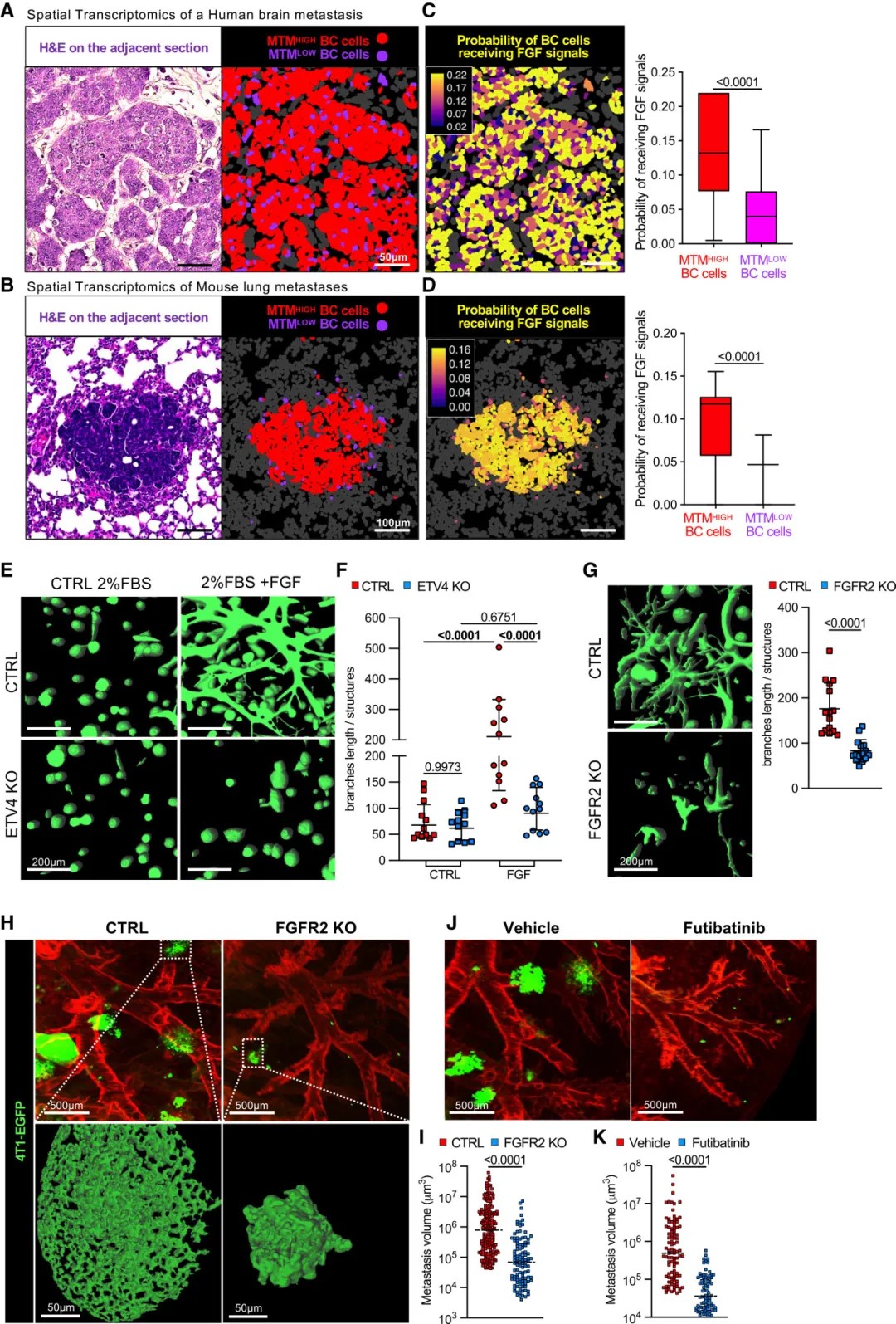 研究还深入探索了肿瘤细胞与微环境如何协同发挥作用。空间转录组学分析显示,在转移灶中,肿瘤相关成纤维细胞或星形胶质细胞会释放成纤维细胞生长因子。该信号被肿瘤细胞上的受体接收,从而促进其分支生长。功能实验证实,阻断这一信号通路,都能有效抑制转移灶的网状生长和扩大,而对原发肿瘤的生长没有明显影响。这表明,靶向FGF信号通路有望成为一种特异性针对转移阶段的治疗策略。
