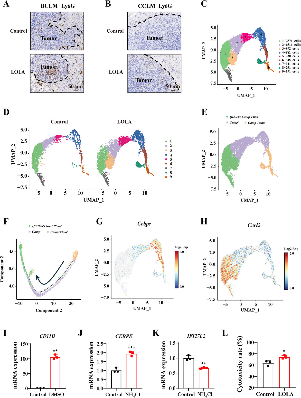 研究人员进一步探讨了LOLA治疗对BCLM小鼠肝转移免疫微环境的影响。结果显示,与未接受LOLA治疗的对照组相比,LOLA显著增加了Mono-AAHM群体的数量和频率。研究结果表明,氨的积累通过抑制Ifi27l2a,损害了Mono-AAHM的抗肿瘤活性。因此,Ifi27l2a的下调可能作为Mono-AAHM功能障碍的生物标志物。