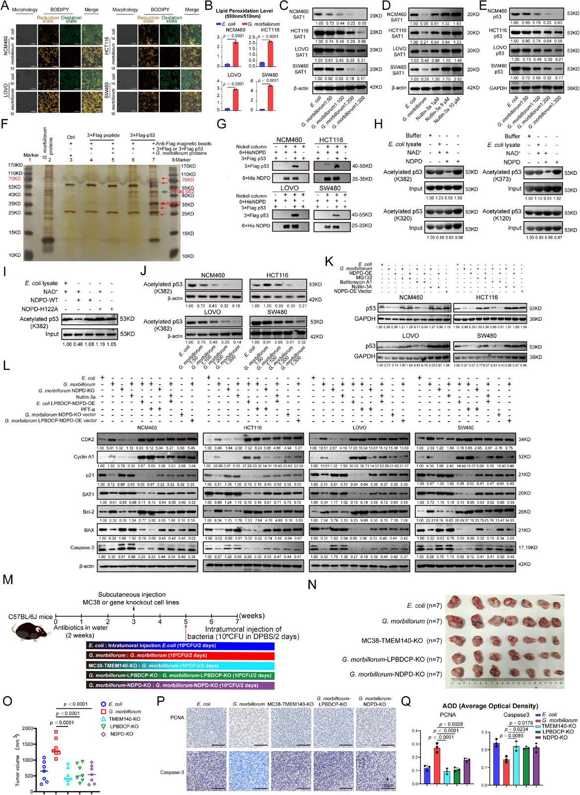 在 MC38 肿瘤荷瘤小鼠中,肿瘤形成后进行瘤内细菌给药,5 周后显示出明显的致癌效应。肿瘤体积分析表明,通过敲除 G. morbillorum 中的 LPBDCP 或 NDPD 以及耗竭宿主细胞中的 TMEM140,G. morbillorum 诱导的肿瘤促进作用被消除。对代表性肿瘤进行免疫组织化学(IHC)分析显示,PCNA 水平升高,Caspase-3 水平降低,表明 G. morbillorum 可促进细胞增殖并抑制细胞凋亡。