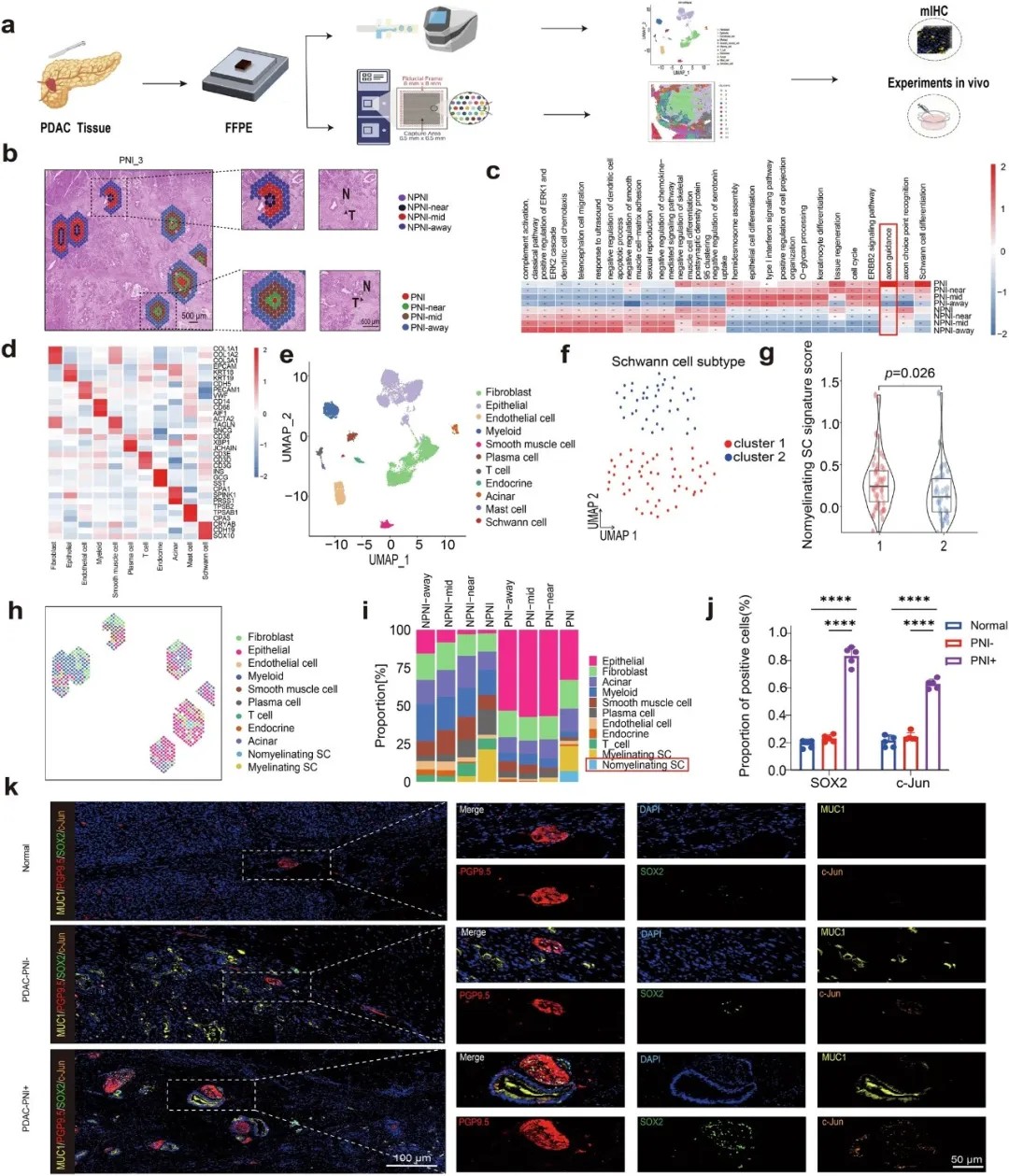 研究通过整合临床样本的RNA测序、空间转录组学和单细胞分析,首次在神经浸润区域观察到一个显著现象:一类处于“去分化”状态的雪旺细胞(SCs)特异性富集。雪旺细胞是外周神经的主要胶质细胞,正常情况下负责营养和支持神经元。但在胰腺癌微环境中,它们被癌细胞重新编程,回到了类似神经损伤后的修复状态。