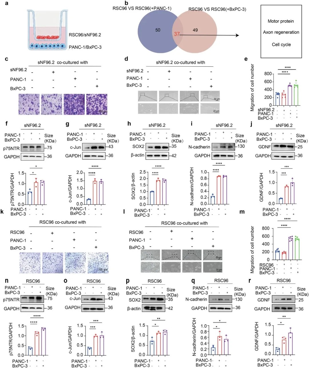 这就好比肿瘤细胞策反了神经的“守卫”雪旺细胞,让它们调转枪口,为肿瘤入侵神经“铺路搭桥”。这些去分化的雪旺细胞高表达p75NTR、SOX2、c-Jun等标志物,形态变为细长、具侵袭性,并展现出强大的迁移能力。