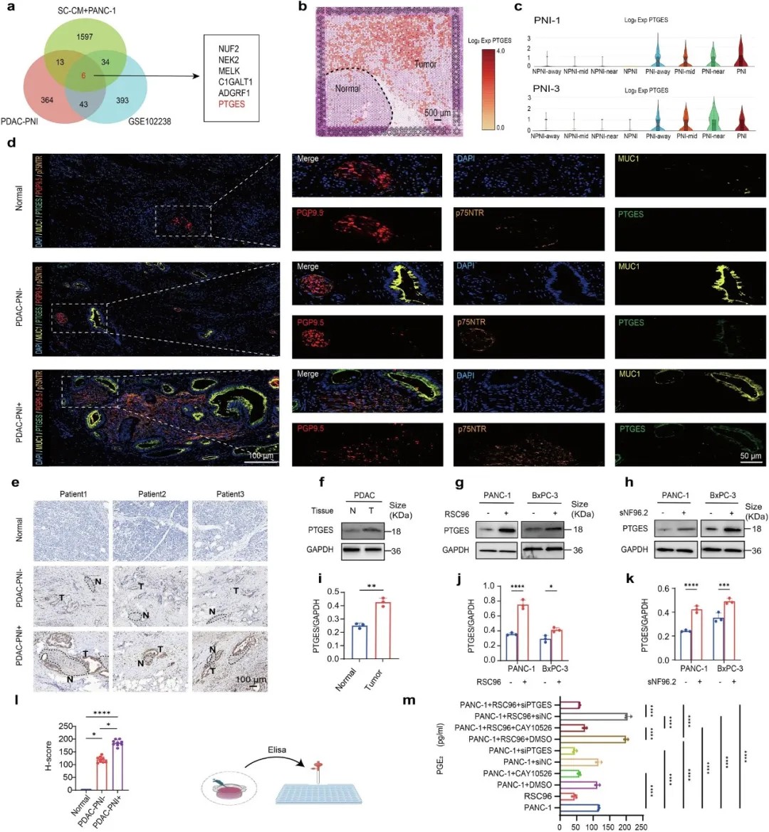 那么,肿瘤细胞发出的策反指令是什么?通过多组学数据交叉分析,研究团队将目光锁定在前列腺素E合成酶(PTGES)及其产物——前列腺素E2(PGE2)上。他们发现,在神经浸润区域的核心,肿瘤细胞高表达PTGES,其表达水平与患者PNI状态正相关。