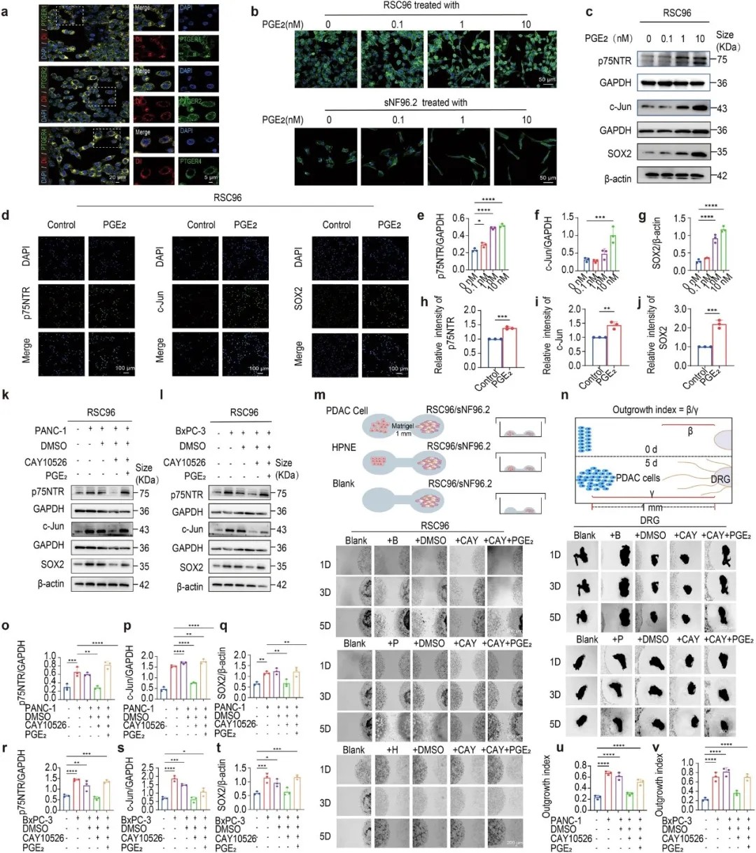 随后的系列实验证实,胰腺癌细胞正是通过分泌PGE2,驱动了雪旺细胞的去分化。在共培养体系中,肿瘤细胞分泌的PGE2能诱导雪旺细胞形态改变,并显著上调其去分化标志物表达。当使用PTGES抑制剂、基因敲低或基因敲除手段阻断癌细胞产生PGE2后,雪旺细胞向肿瘤的定向迁移和神经突触生长能力被显著削弱。