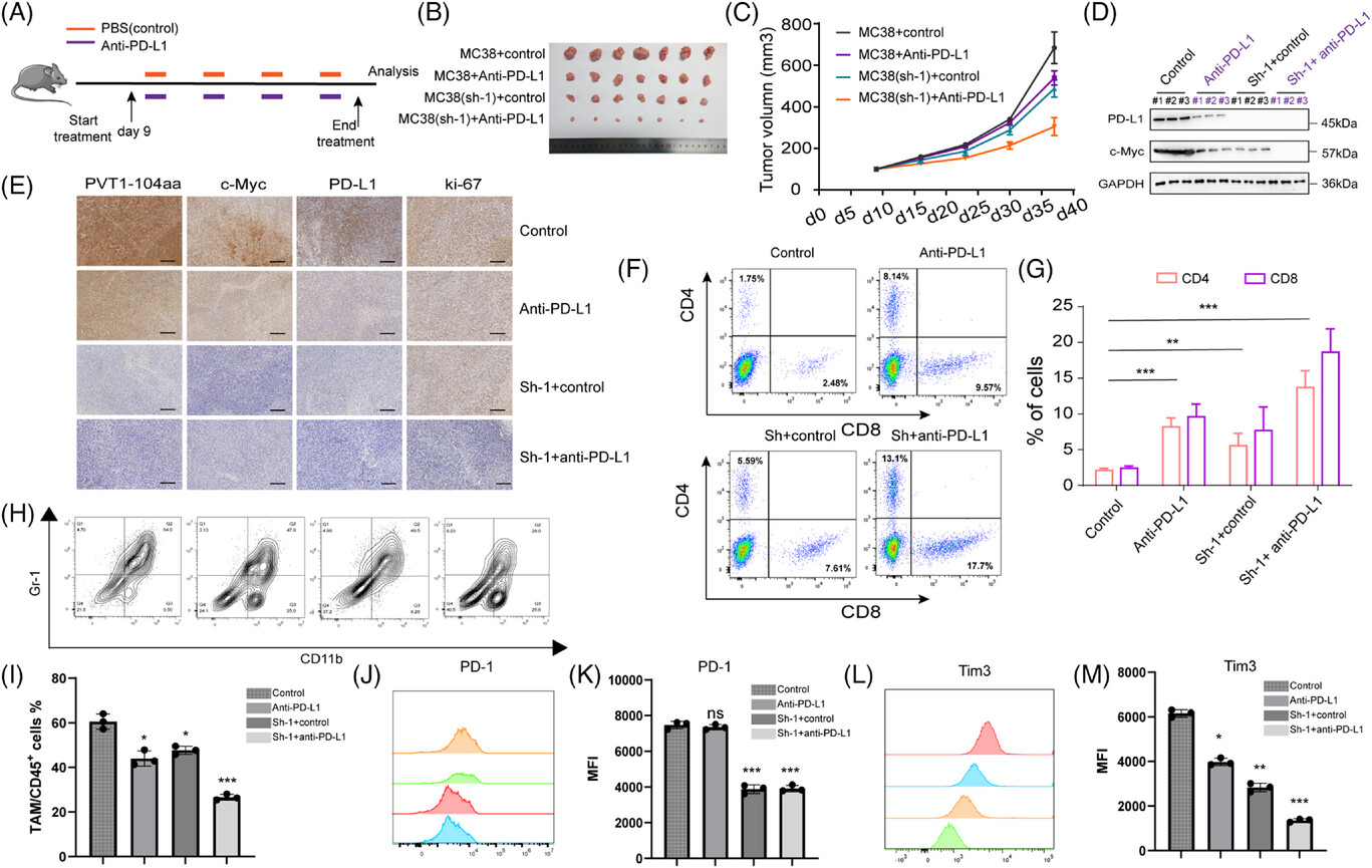 研究人员研究了 PVT1-104aa 表达水平与 PD-L1 抑制剂疗效之间的关系。以 C57BL/6 小鼠为模型,利用野生型 MC38 细胞和 circPVT1 敲低 MC38 细胞建立了同基因肿瘤模型,以探究 PVT1-104aa 表达水平对 PD-L1 抑制剂疗效的影响,并与安慰剂对照组(每组体内实验 N = 7)进行比较。结果表明,单独的 PVT1-104aa 敲低或 PD-L1 抑制剂单药治疗在体内仅适度抑制肿瘤生长,而联合治疗则表现出显著增强的抗肿瘤效果,揭示了这两种治疗方式之间的协同作用。与另外三个治疗组相比,接受 PVT1-104aa 敲低和 PD-L1 抑制剂联合治疗的肿瘤,其 c-Myc 和 PD-L1 的表达水平最低。为了评估 PVT1-104aa 耗竭和抗 PD-L1 治疗对肿瘤微环境的影响,研究人员通过流式细胞术检测了上述四个治疗组的肿瘤浸润淋巴细胞(TILs)。比较分析显示,PVT1-104aa 敲低组、PD-L1 抑制剂单药治疗组以及联合治疗组的肿瘤组织中 CD4+ 和 CD8+ T 细胞浸润显著增强,与对照组相比差异显著。联合治疗组的效果最为显著。此外,研究人员还在 PVT1-104aa 缺失的异种移植瘤中检测到 CD4+ 和 CD8+ T 细胞浸润的增加。为了评估 PVT1-104aa 敲低和抗 PD-L1 治疗对肿瘤相关髓源性抑制细胞(MDSCs)和 T 细胞耗竭的影响,研究人员通过流式细胞术分析了 TILs。与对照组相比,PVT1-104aa 敲低组中 CD45+ 肿瘤相关免疫细胞内 CD11b+Gr-1+ MDSCs 的比例显著降低,当 Sh-1 敲低与抗 PD-L1 治疗联合使用时,该比例进一步降低。定量分析显示,在 PVT1-104aa 敲低联合抗 PD-L1 治疗组中,髓源性抑制细胞(MDSCs)呈协同性减少。为进一步评估 T 细胞功能,研究人员通过流式细胞术定量检测肿瘤浸润 T 细胞中细胞毒性标志物颗粒酶 B(GZMB)和穿孔素(PRF1)的表达。此外,通过平均荧光强度(MFI)测定 CD8+ T 细胞上耗竭标志物 PD-1 和 Tim-3 的表达水平,在 PVT1-104aa 敲低组中显著降低,在联合治疗组中则进一步受到抑制。综上所述,这些实验结果确立了 PVT1-104aa 作为结直肠癌(CRC)有前景的治疗靶点。PVT1-104aa 抑制与 PD-L1 阻断的联合策略在小鼠 CRC 模型中显示出显著的协同疗效,提示了一种新的临床转化组合策略。