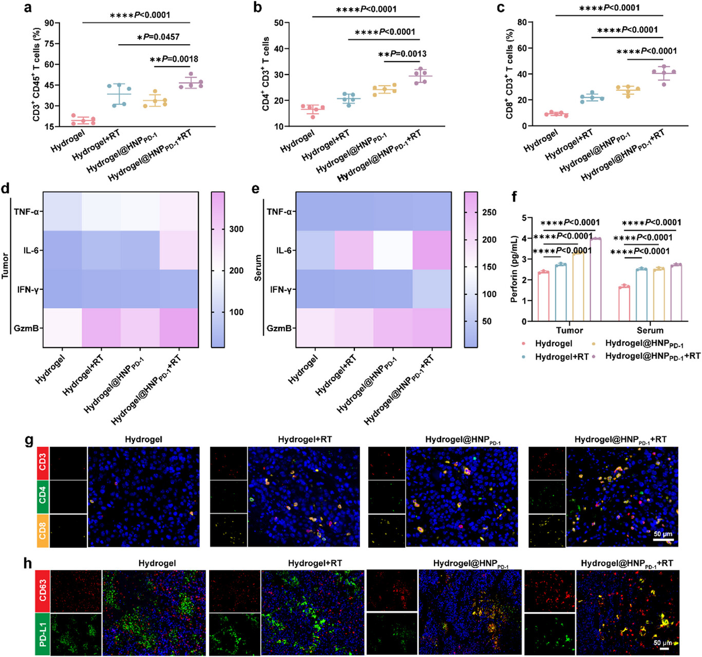 为了探究水凝胶@HNP增强的治疗效果是否由肿瘤内T细胞浸润和活化的改善所介导,研究人员分析了经不同治疗后肿瘤组织中T细胞的群体和表型特征。与仅接受水凝胶治疗的小鼠相比,接受水凝胶@HNP +RT治疗的小鼠CD3 T细胞比例增加了3.05倍。进一步分析显示,水凝胶@HNP +RT组的CD3 T细胞比例比单独接受水凝胶治疗的小鼠高2.38和5.肿瘤浸润CD3 CD4 T细胞和CD3 CD8 T细胞分别增加了98倍,与水凝胶对照组相比,表明T细胞浸润显著增强。肿瘤切片的免疫荧光染色也证实了这些结果,显示在水凝胶@HNP + RT组中CD8和CD4 T细胞的浸润程度较高,而在水凝胶治疗组中观察到的浸润程度极低。综上所述,这些结果表明,水凝胶@HNP与RT的联合应用能显著增强T细胞的浸润和活化,从而促使其发挥显著的抗肿瘤功效。