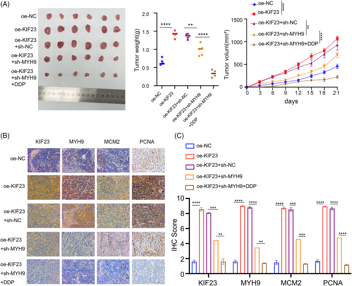 最后,研究人员利用小鼠皮下肿瘤异种移植模型在体内验证了上述发现。数据显示,与对照组相比,MYH9敲低组的肿瘤生长速率和最终重量均显著降低。此外,联合治疗(oe-KIF23 + sh-MYH9 + DDP)产生了最显著的抑制效果,导致肿瘤体积和重量在所有组中均为最低。免疫组化分析显示,MYH9敲低有效逆转了KIF23的促增殖作用,且与DDP化疗联合后,这种抑制作用进一步增强。这些发现通过WB在移植瘤组织中得到了进一步验证。综上所述,这些数据支持以下结论:MYH9是KIF23促进CC细胞增殖和原发性DDP耐药的关键下游介质。