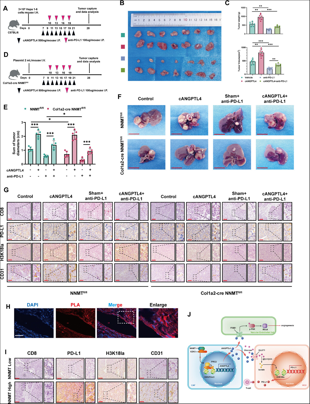 此外,研究人员对小鼠肝癌组织进行了PLA探针检测,结果证实了NNMT与EZH2之间的相互作用。最后,研究人员在临床样本中验证了这些结果,显示在肝癌组织的CAF中,PD-L1、H3K18la、PD-L1和CD31的水平与NNMT和ANGPTL4的表达呈正相关。这些结果表明,CAF中的NNMT-ANGPTL4轴可能是肝癌治疗的一个有前景的靶点。此外,在NNMT高表达组中抑制ANGPTL4的表达和分泌可增强抗PD-L1的疗效,为肝癌免疫治疗提供了新的方向。