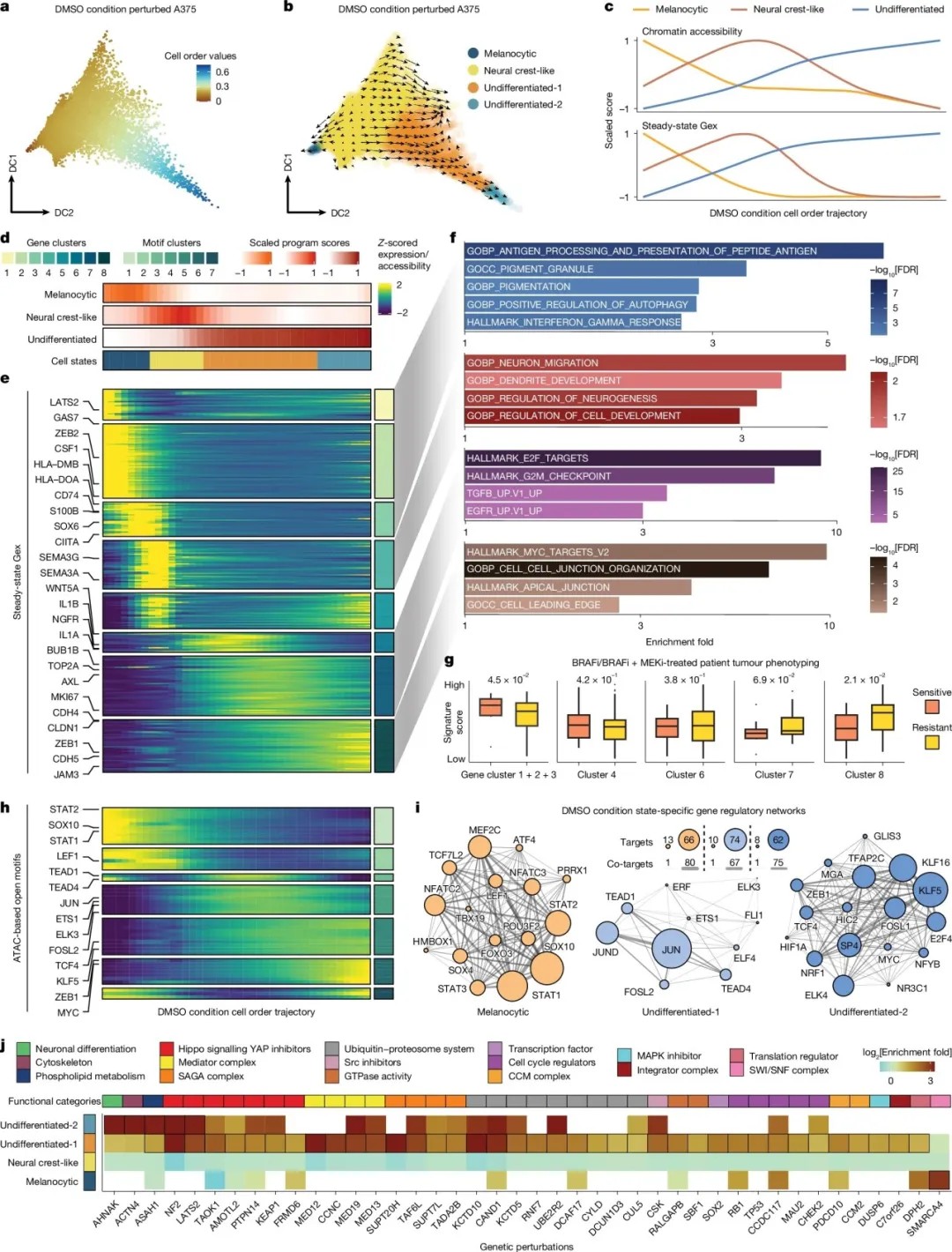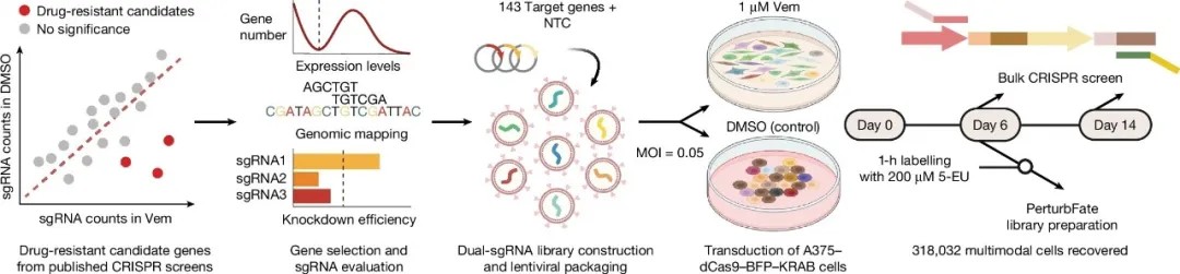 利用PerturbFate,研究人员在携带BRAF突变的A375黑色素瘤细胞系中,系统扰动了超过140个与维莫非尼耐药相关的候选基因,并对超过30万个细胞进行了多组学分析。