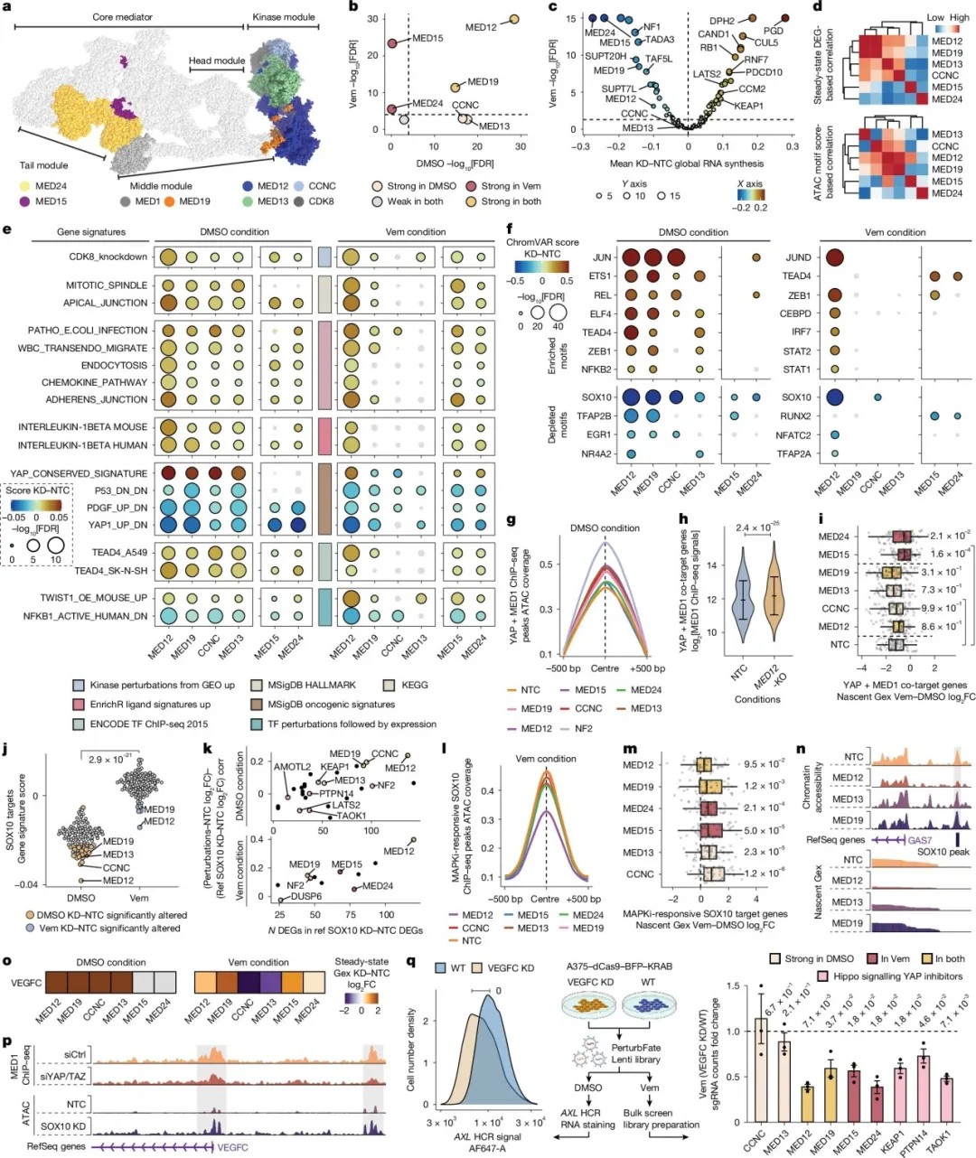 独特的MED12:除了作为激酶模块的一部分解除对YAP-TEAD的抑制外,MED12的敲低还会特异性地损害分化主导因子SOX10的活性和其靶基因的表达。这种双重作用使得MED12扰动在无论有无药物存在的情况下,都能强烈驱动去分化和耐药。