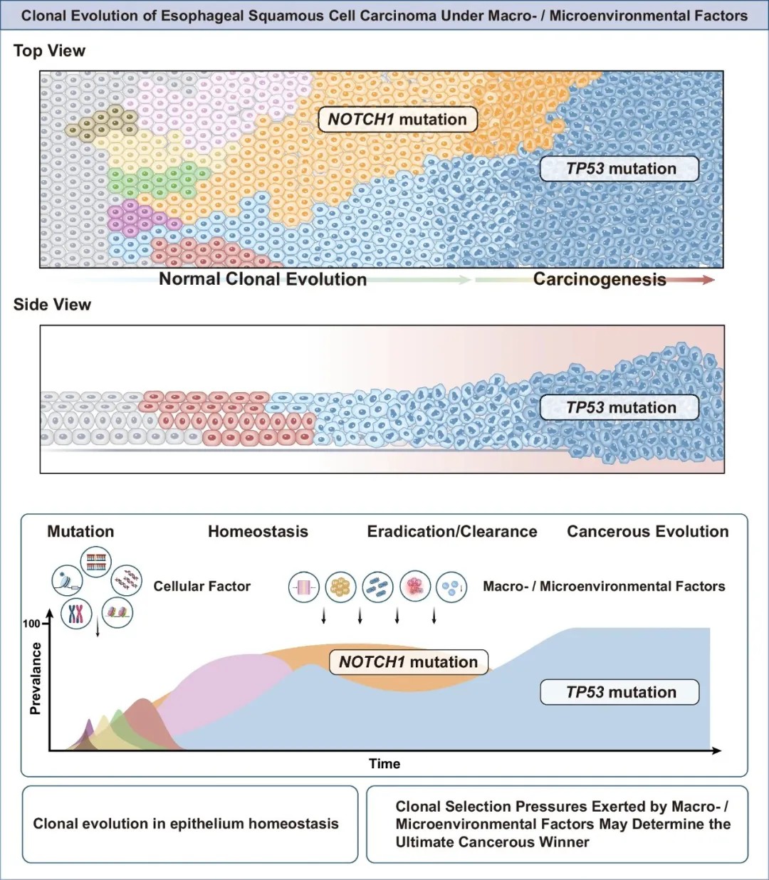 研究指出,食管癌的发生是一个多步骤、克隆进化的过程。在看似正常的食管上皮中,随着年龄增长,TP53、NOTCH1等突变克隆会不断积累和扩张。有趣的是,某些突变形成的克隆甚至能通过竞争抑制高危的TP53突变克隆,起到延缓癌变的作用。然而,一旦获得关键的驱动事件,恶性克隆将最终胜出并演进为癌症。