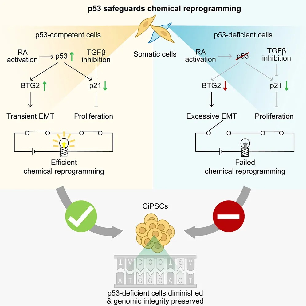 传统上,在基于“山中因子”等转录因子的重编程过程中,p53因其抑制细胞增殖的特性而被视作效率障碍,其活性常被抑制。然而,该研究显示,在完全使用化学小分子进行重编程时,p53的功能发生了根本性反转——它从“障碍”转变为不可或缺的“效率促进因子”和“基因组守护者”。 抑制p53,反而会严重损害CiPSC的生成。这一发现标志着化学重编程在底层调控逻辑上与转录因子重编程存在本质区别。